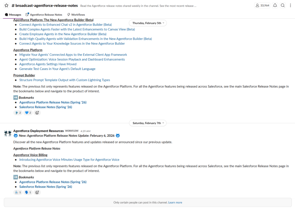 Jednym z najmocniejszych elementów społeczności jest kanał Broadcast Agentforce Release Notes. Przy tempie releasów Agentforce, które dorównują produktom AI z rynku konsumenckiego, brak centralnego źródła prawdy byłby krytycznym ryzykiem. Salesforce rozwiązał to, tworząc proces publikacji skróconych, operacyjnych release notesów dostępnych w Slacku w tym samym dniu, w którym funkcja pojawia się na platformie. To odpowiedź na problem, który wiele polskich zespołów zna aż za dobrze: funkcja trafia do orga wcześniej niż dokumentacja, a architekci muszą reagować ad hoc, bo agent nagle zaczyna działać inaczej.