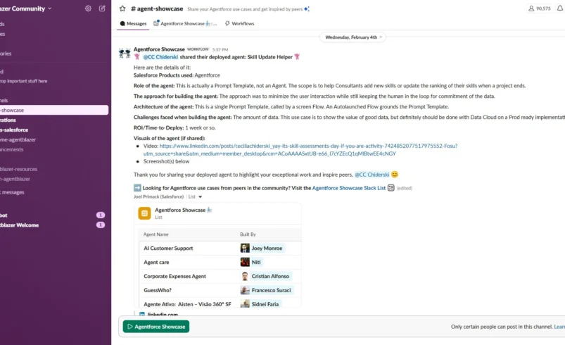 Jednym z najmocniejszych elementów społeczności jest kanał Broadcast Agentforce Release Notes. Przy tempie releasów Agentforce, które dorównują produktom AI z rynku konsumenckiego, brak centralnego źródła prawdy byłby krytycznym ryzykiem. Salesforce rozwiązał to, tworząc proces publikacji skróconych, operacyjnych release notesów dostępnych w Slacku w tym samym dniu, w którym funkcja pojawia się na platformie. To odpowiedź na problem, który wiele polskich zespołów zna aż za dobrze: funkcja trafia do orga wcześniej niż dokumentacja, a architekci muszą reagować ad hoc, bo agent nagle zaczyna działać inaczej.