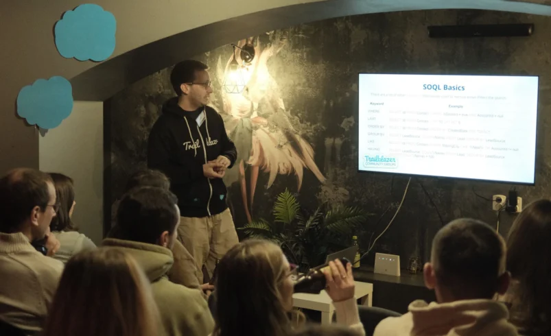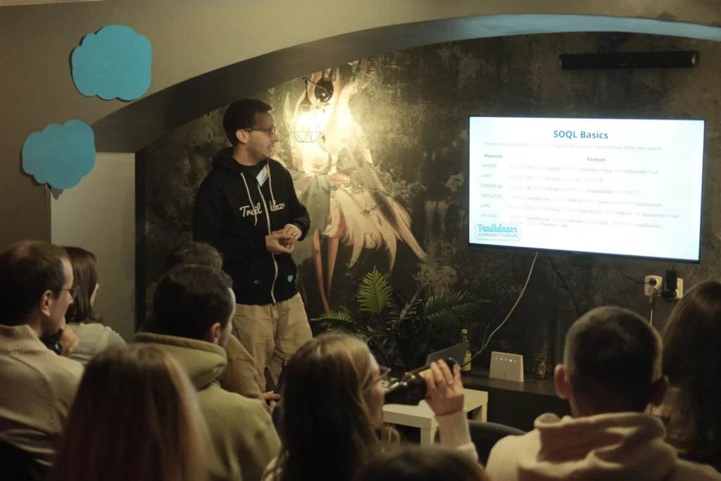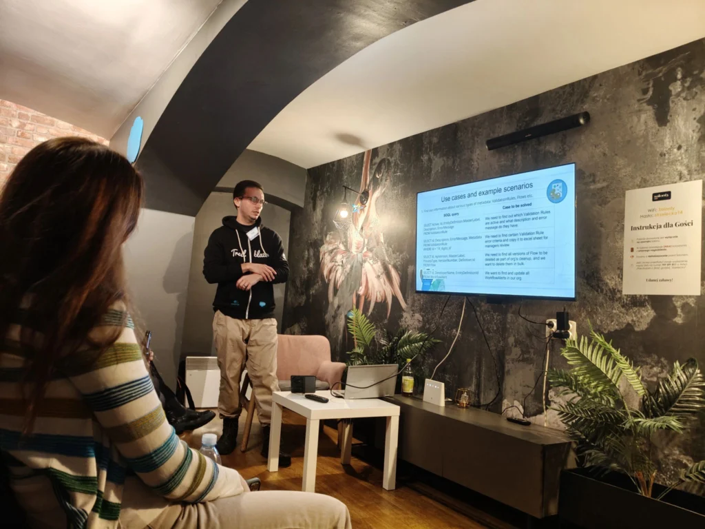 Spotkanie rozpoczęło się prelekcją Hliba Kovalenki, Salesforce konsultanta i mentora, który z humorem i praktycznym zacięciem przeprowadził uczestników przez meandry dwóch najważniejszych języków zapytań w Salesforce: SOQL i SOSL.