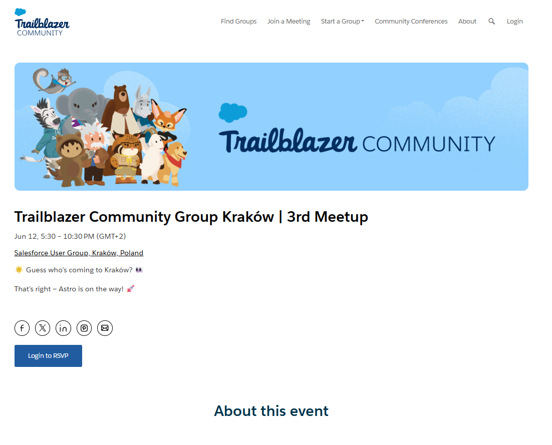 We’re thrilled to share that another Salesforce Trailblazer Community Meeting is happening soon in Kraków, and Astro will be there in spirit, representing the energy, learning, and fun that bring Trailblazers together.